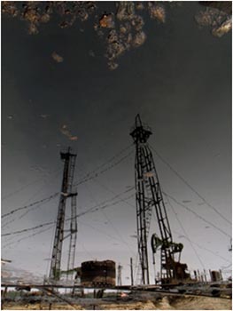 Le pétrole est un sujet sensible dans notre société. Le prix du brut est devenu incontrôlable. La série « Terrain glissant » est un miroir de l’Occident. Dans ces flaques de pétrole qui s’agrandissent de jour en jour se reflète une faille critique du système-mondial. A cet endroit, le sol est complètement ravagé, après qu’on ait tiré de ses entrailles cet or poisseux. Nombreux sont ceux qui ont exploité ces terres, mais personne pour les nettoyer et les fertiliser. Cette série montre la brutalité d’un site d’exploitation de matière fossile, endroit de honte où les hommes comme la terre sont traités en esclaves, jusqu’à ce qu’ils rendent leur dernier pétrodollar, puis abandonnés.